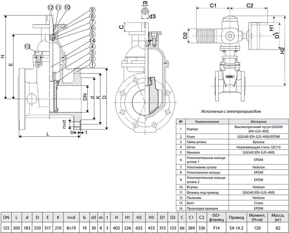 Задвижка ADL ГРАНАР KR15 Ду 125 Ру 16 фланцевая клиновая чугунная с электроприводом AUMA SA 14.2 с обрезиненным клином