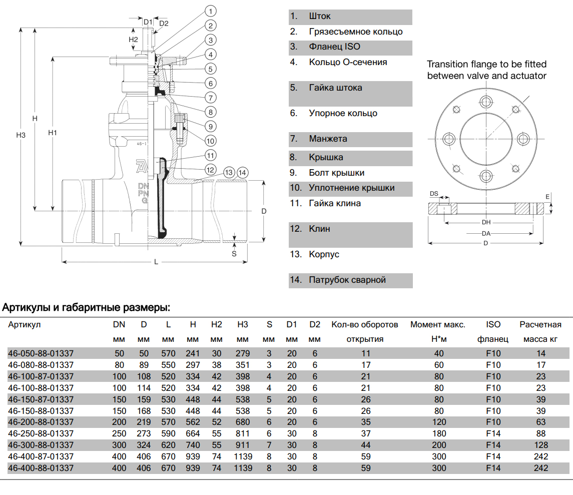 Задвижка AVK 46/78 DN 80 PN 16 с длинными сварными патрубками