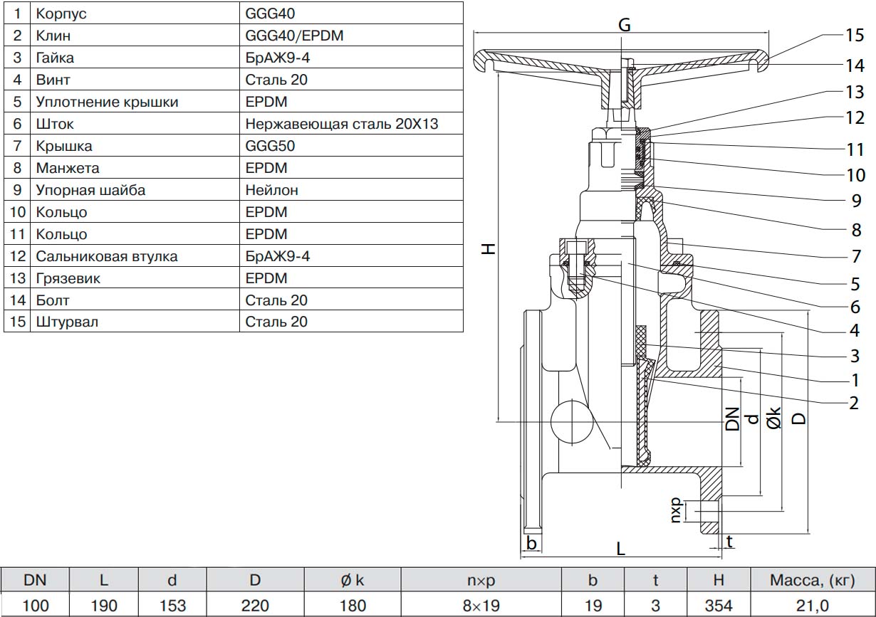 Задвижка ГРАНАР KR11 Ду 100 Ру 10/16 фланцевая клиновая чугунная под штурвал с обрезиненным клином KR11.02.100.16 Ф/Ф