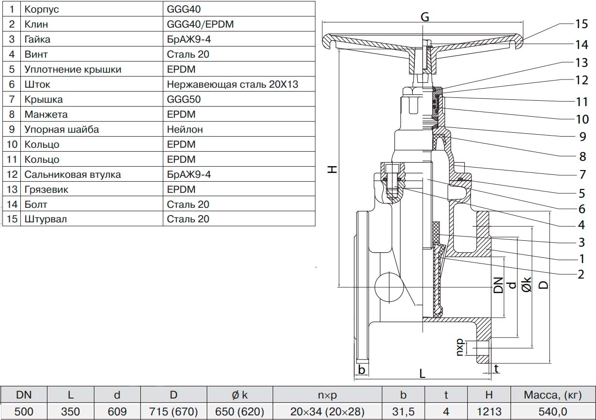 Задвижка ГРАНАР KR11 Ду 500 Ру 10 фланцевая клиновая чугунная под штурвал с обрезиненным клином KR11.02.500.10 Ф/Ф