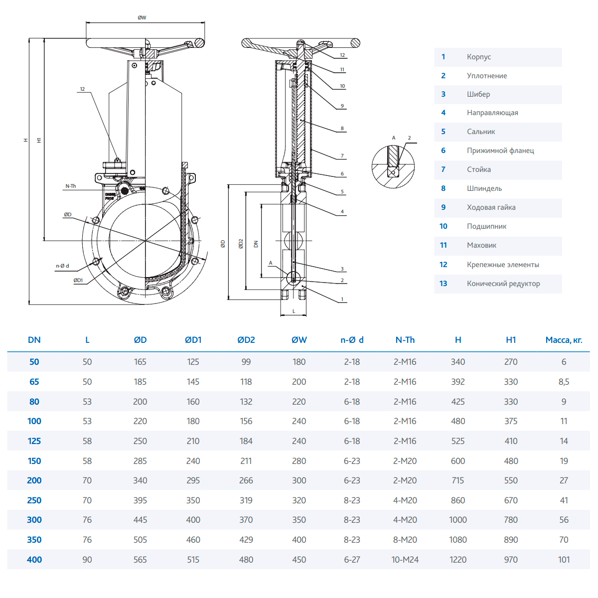 Задвижка DENDOR K21GV DN 50 PN 10 шиберная межфланцевая