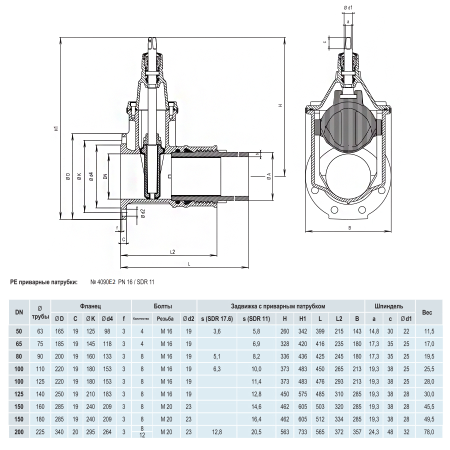 Задвижка HAWLE 4090E2 DN 65/75 PN 16 фланец - ПЭ патрубок клиновая чугунная с обрезиненным клином