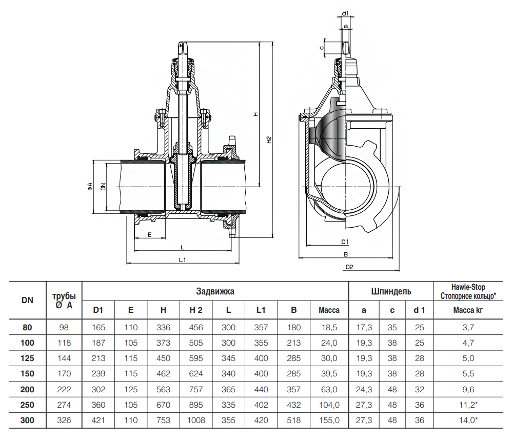 Задвижка HAWLE 4500E2 DN 100/118 PN 16 раструбная клиновая чугунная с обрезиненным клином