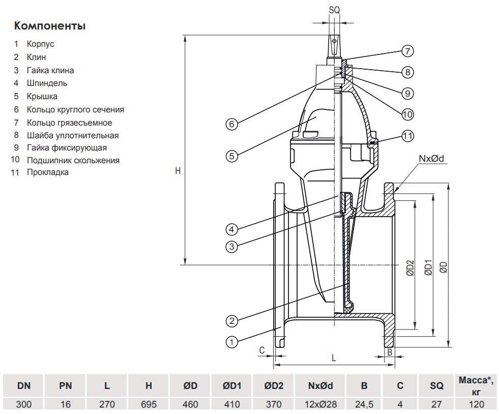 Задвижка VGA D17.04 DN 300 PN 16 L=270 мм фланцевая клиновая чугунная с маховиком с обрезиненным клином