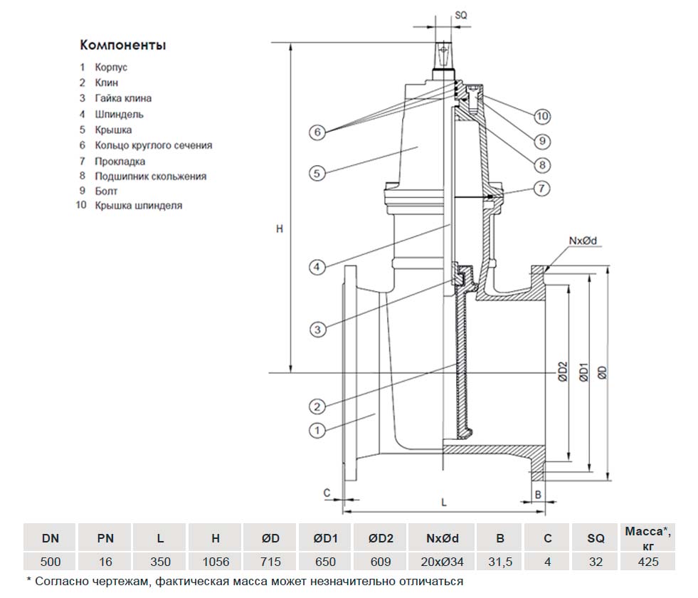 Задвижка VGA D17.04 DN 500 PN 16 L=350 мм фланцевая клиновая чугунная с маховиком с обрезиненным клином