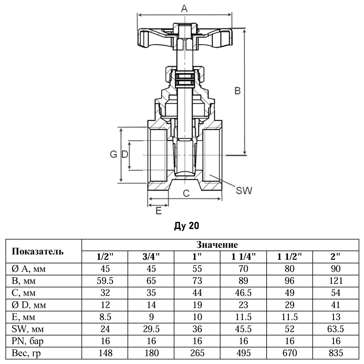 Задвижка клиновая VALFEX VF.04 ВР 3/4" Ду 20 Ру 16 латунная