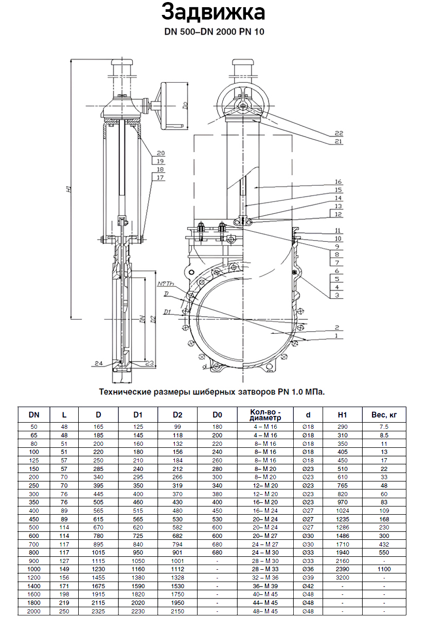 Задвижка Kvant KV02 DN 1000 PN 10 шиберная межфланцевая со штурвалом