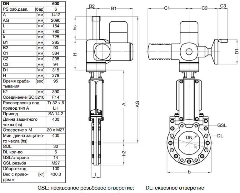 Задвижка шиберная ножевая VAG ZETA DN 600 PN 10 с электроприводом AUMA SA14.2