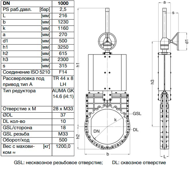 Задвижка шиберная ножевая VAG ZETA DN 1000 PN 10 со штурвалом