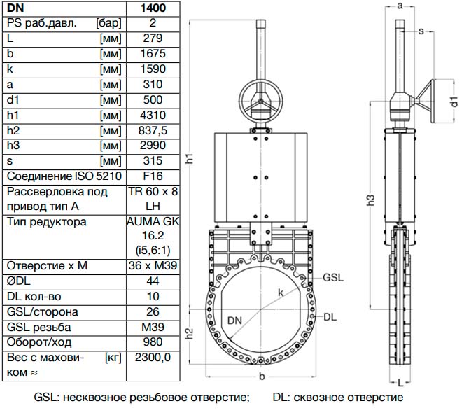 Задвижка шиберная ножевая VAG ZETA DN 1400 PN 10 со штурвалом