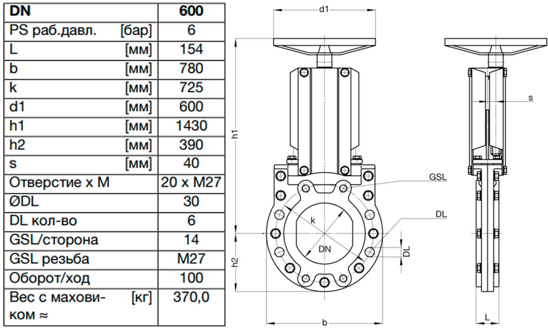 Задвижка шиберная ножевая VAG ZETA DN 600 PN 10 со штурвалом