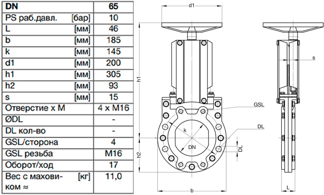 Задвижка шиберная ножевая VAG ZETA DN 65 PN 10 со штурвалом