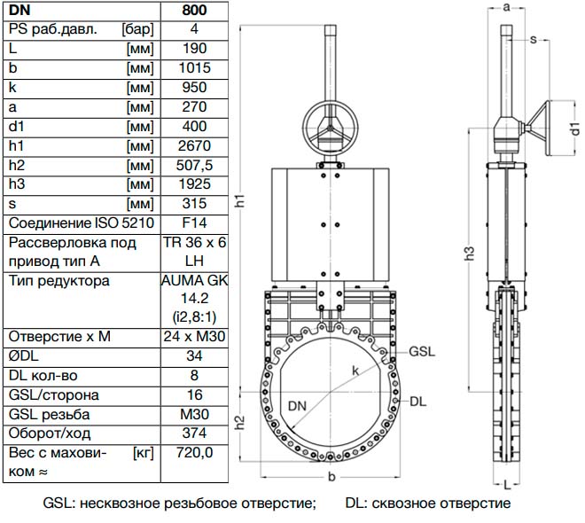 Задвижка шиберная ножевая VAG ZETA DN 800 PN 10 со штурвалом
