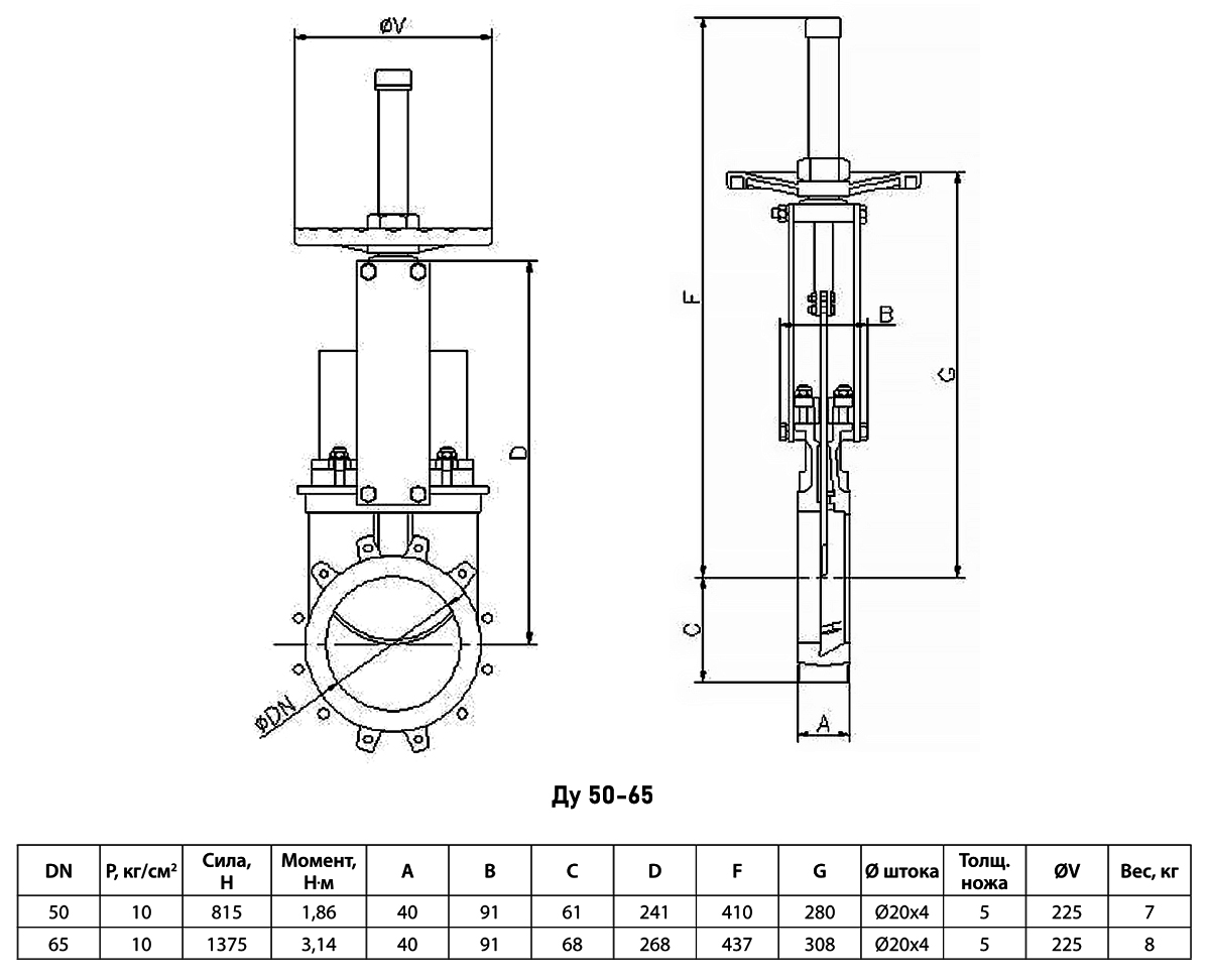Задвижка шиберная односторонняя СМО A-01-HW-M Ду 65 Ру 10 с выдвижным шпинделем чугунная межфланцевая со штурвалом