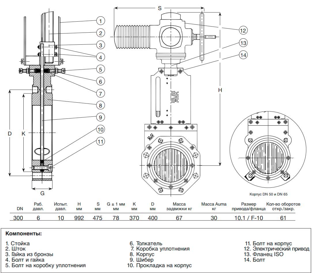 Задвижка шиберная с выдвижным шпинделем с электроприводом AVK 702/70 PN 10 DN 300