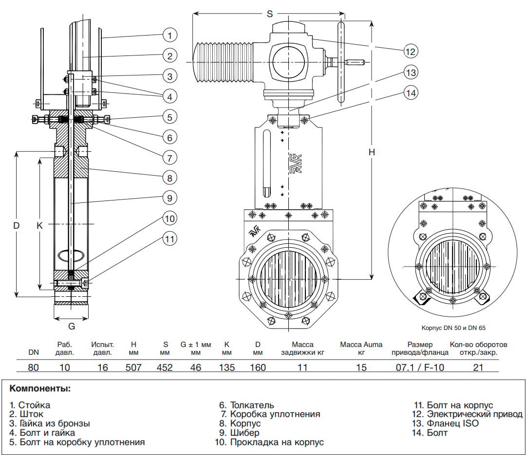 Задвижка шиберная с выдвижным шпинделем с электроприводом AVK 702/70 PN 10 DN 80
