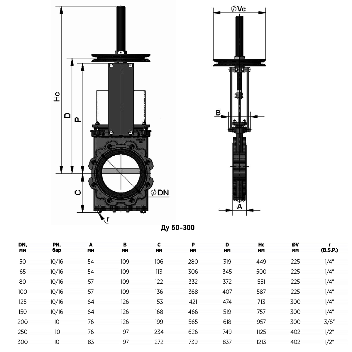 Задвижка шиберная VALSTOK VGL-012-01-HW-NR Ду 50 Ру 10/16 двусторонняя чугунная межфланцевая штурвал с выдвижным шпинделем