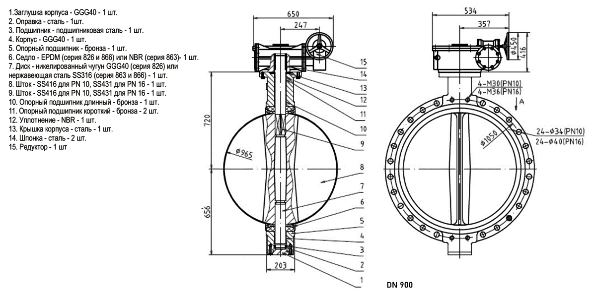 Затвор дисковый поворотный ABRA BUV-VF 863 DN 900 PN 16 межфланцевый с редуктором