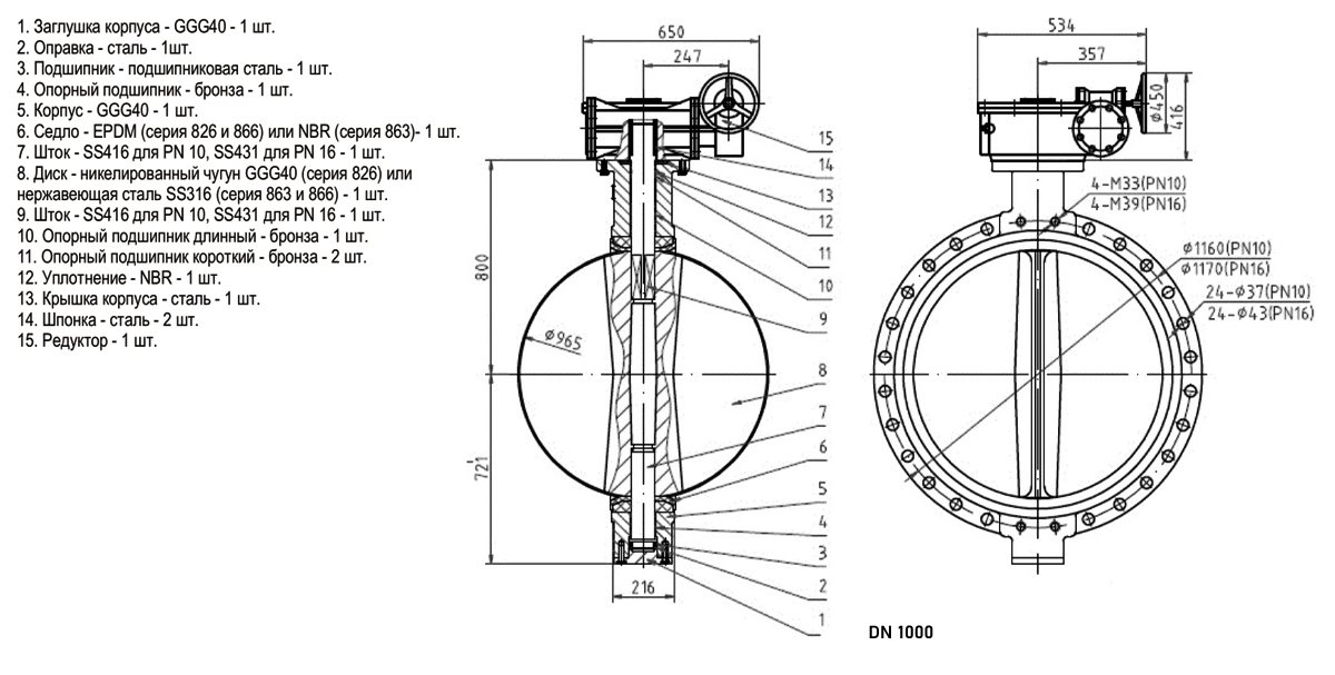 Затвор дисковый поворотный ABRA BUV-VF 866 DN 1000 PN 16 межфланцевый с редуктором