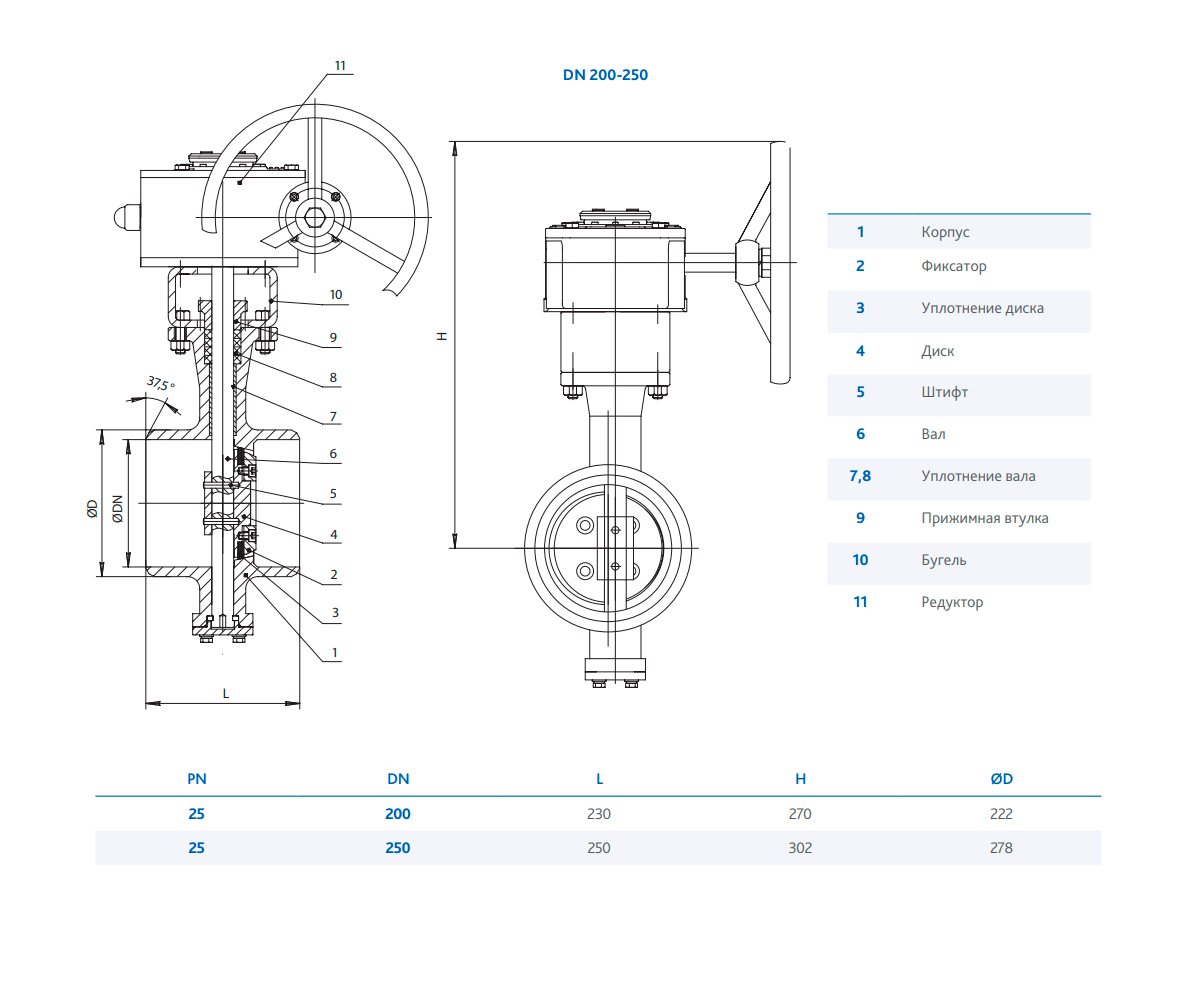 Затвор DENDOR 027W DN 200 PN 25 поворотный дисковый с тремя эксцентриситетами под приварку стальной